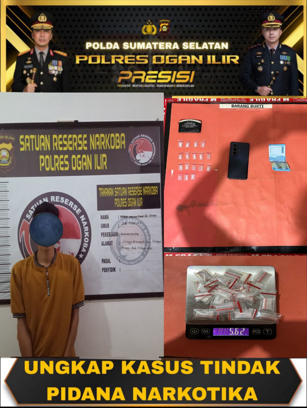 “Polda Sumatera Selatan berkomitmen penuh untuk menindak tegas setiap pelaku peredaran narkoba. Kami juga mengapresiasi peran aktif masyarakat yang telah memberikan informasi sehingga kasus ini dapat diungkap dengan cepat,” ujarnya.