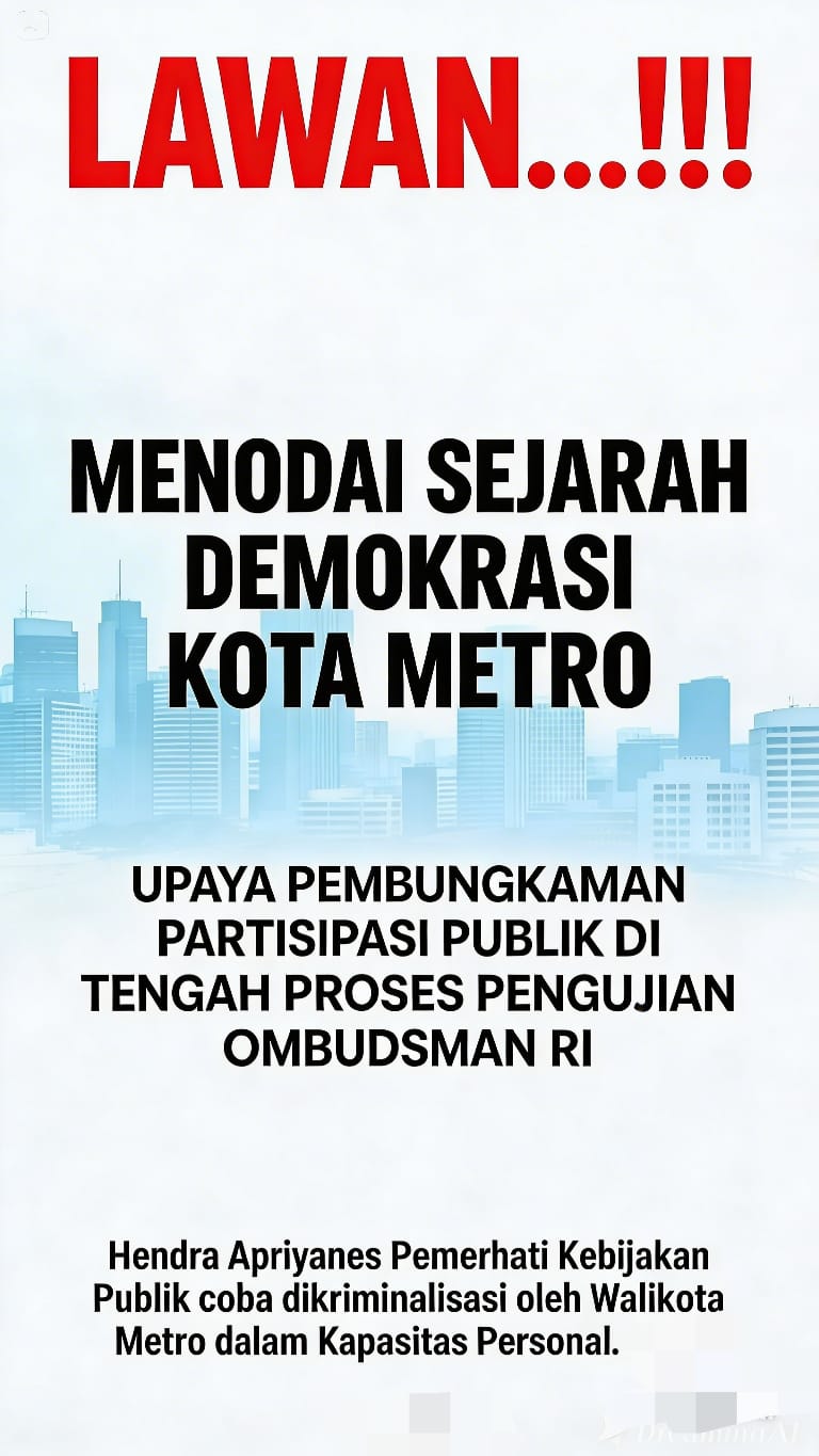 KOTA METRO, Beritafaktanews.id//– Hendra Apriyanes (Anes), Pemerhati Kebijakan Publik, menyampaikan keprihatinan mendalam atas tindakan Wali Kota Metro, Hi. Bambang Imam Santoso, yang secara personal memperkarakan warga negaranya sendiri atas kritik administratif terhadap tata kelola pemerintahan. Langkah ini dipandang sebagai preseden buruk yang mulai menodai sejarah perjalanan demokrasi dan keterbukaan informasi di Kota Metro melalui upaya “tangan besi” untuk menekan daya kritis masyarakat.