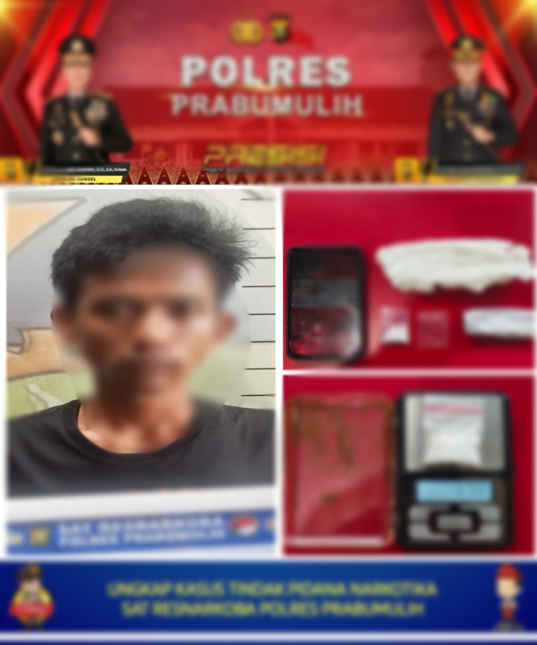 Barang bukti yang berhasil diamankan meliputi satu paket sabu, satu unit handphone merek Realme warna biru, satu lembar kertas timah rokok, serta satu lembar tisu putih.
