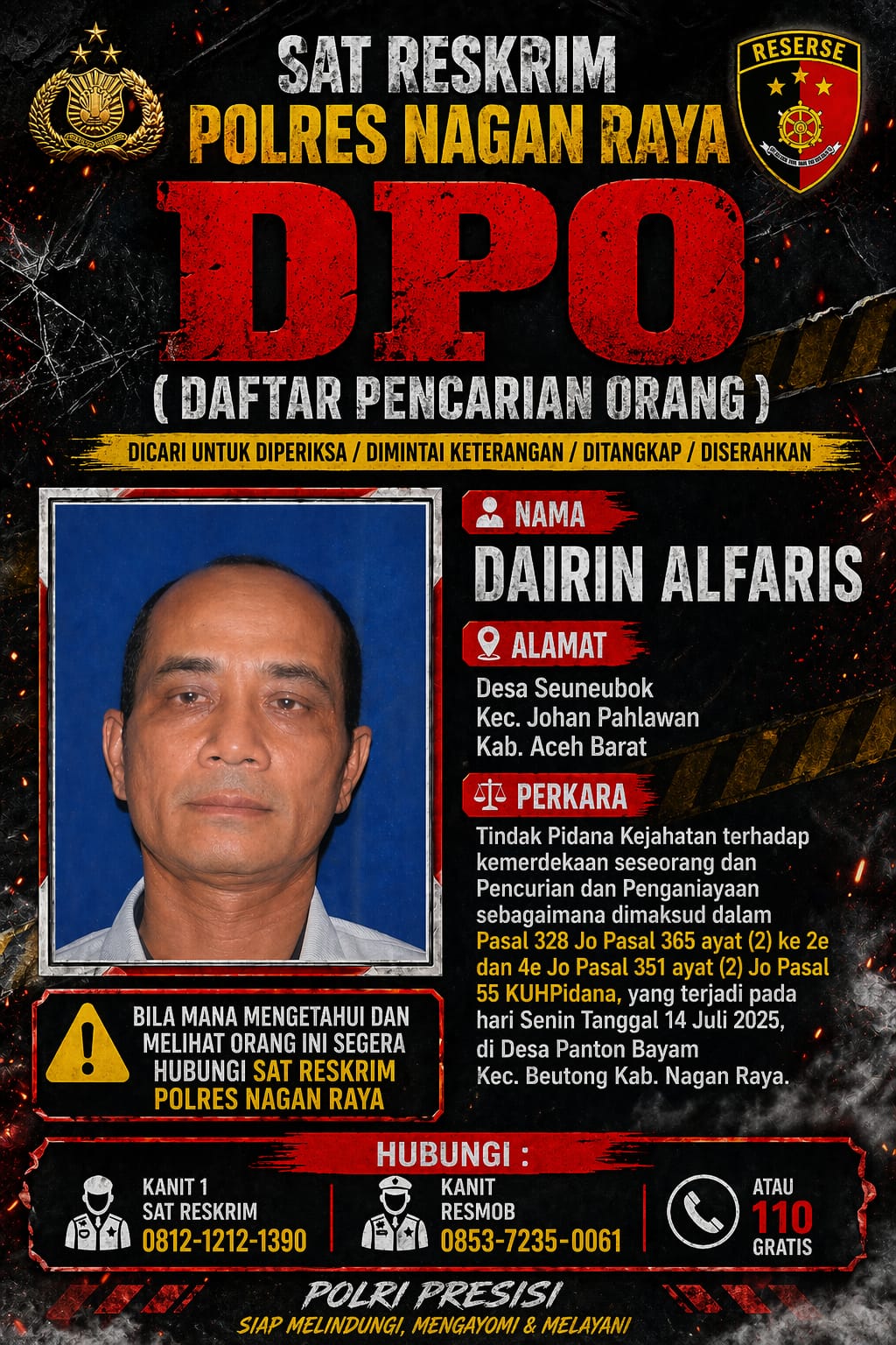 Polres Nagan Raya juga mengimbau kepada masyarakat yang mengetahui keberadaan DPO tersebut agar segera melaporkan kepada pihak Kepolisian terdekat atau langsung menghubungi Sat Reskrim Polres Nagan Raya.