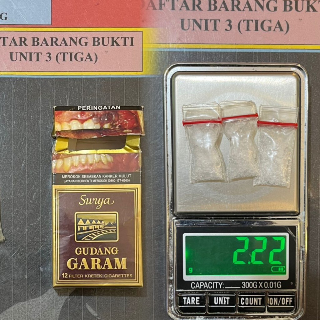 Barang bukti yang diamankan meliputi tiga bungkus plastik klip bening berisi narkotika jenis shabu dengan berat bruto 2,22 gram, satu buah pipet plastik runcing, satu unit timbangan digital warna silver, serta satu kotak rokok yang digunakan sebagai tempat penyimpanan. Tersangka mengakui bahwa barang tersebut merupakan miliknya yang akan diedarkan kembali.