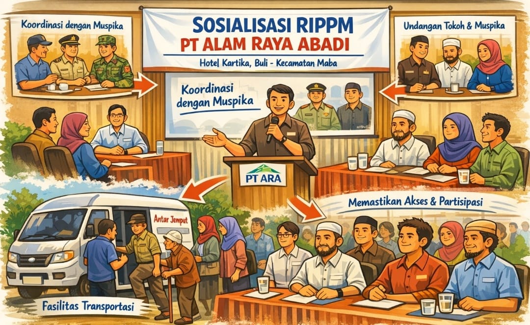 Halmahera Timur – Pelaksanaan sosialisasi Rencana Induk Pemberdayaan dan Pengembangan Masyarakat (RIPPM) PT Alam Raya Abadi (ARA) yang digelar di Hotel Kartika, Buli, Kecamatan Maba, mendapat sejumlah sorotan terkait lokasi kegiatan yang berada di luar wilayah Kecamatan Wasile.