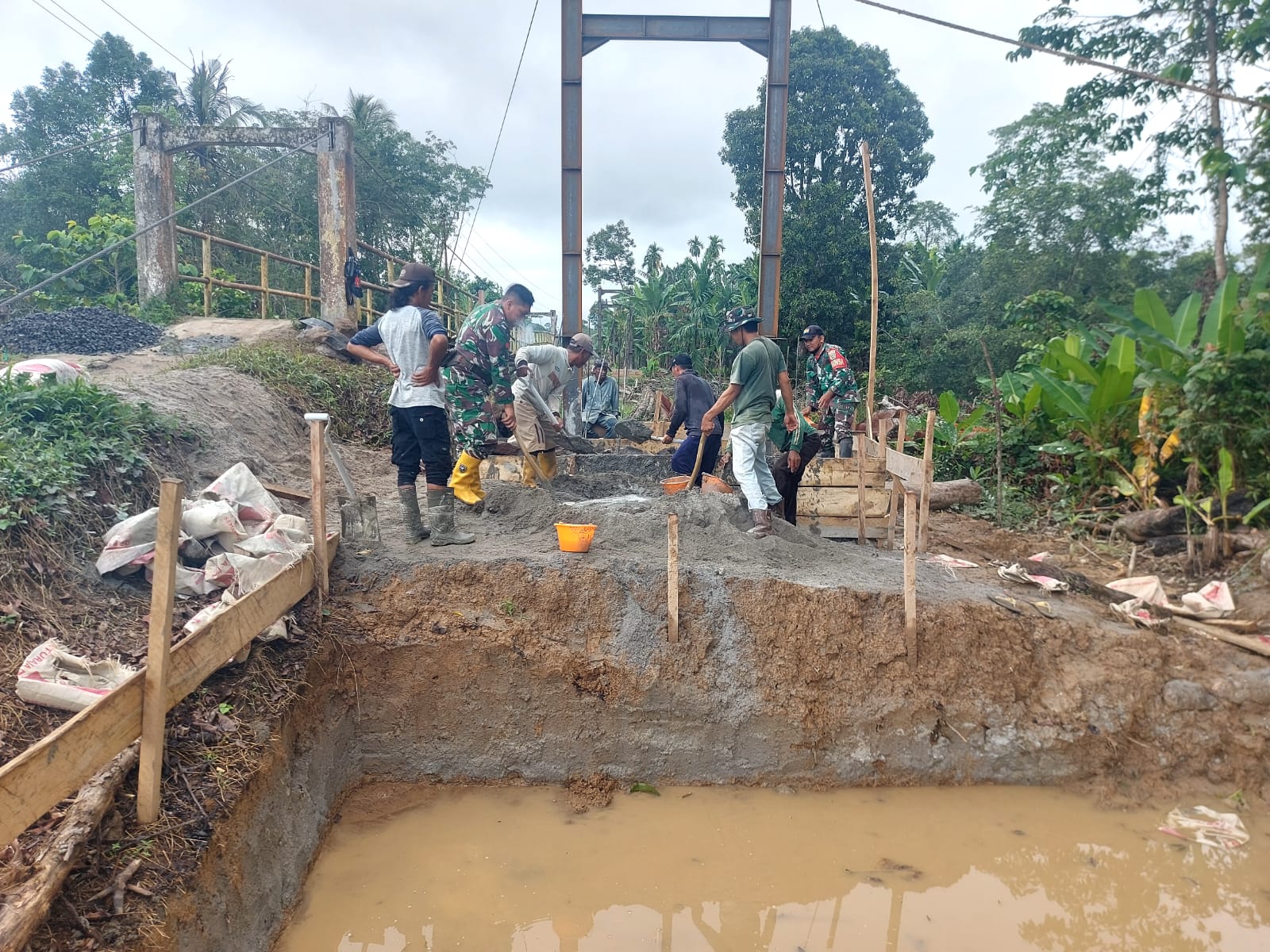Di lapangan, pengerjaan telah memasuki tahap krusial. Para prajurit bersama tim teknis terlihat fokus melakukan penggalian pondasi, pemasangan besi cakar ayam sebagai penguat struktur, hingga proses pengecoran. Tak hanya itu, penimbunan lantai jembatan juga dilakukan secara paralel guna memastikan konstruksi yang kokoh, aman, dan tahan lama.
